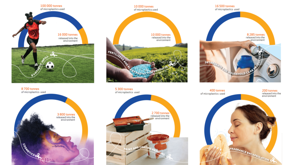 V kosmetice se mezitím již mění situace. V některých přímořských zemích je již přidávání mikroplastů do kosmetiky zakázáno. V EU vyšel v září 2023 také zákaz dodávání mikroplastů do vybraných produktů. Nejedná se pouze o kosmetický průmysl, ale také o konvenční zemědělství, kde jsou mikroplasty používány jako aditiva k pesticidům, nátěrové hmoty a prostředky pro potřeby umělých trávníků, viz grafika Evropské chemické agentury ECHA, která ukazuje jaký objem roční produkce mikroplastů se v jednotlivých odvětvích dostává do prostředí. Na stránkách ECHA najdete více k nové legislativě, na jejíž adaptaci mají producenti nyní 4 – 12 let.